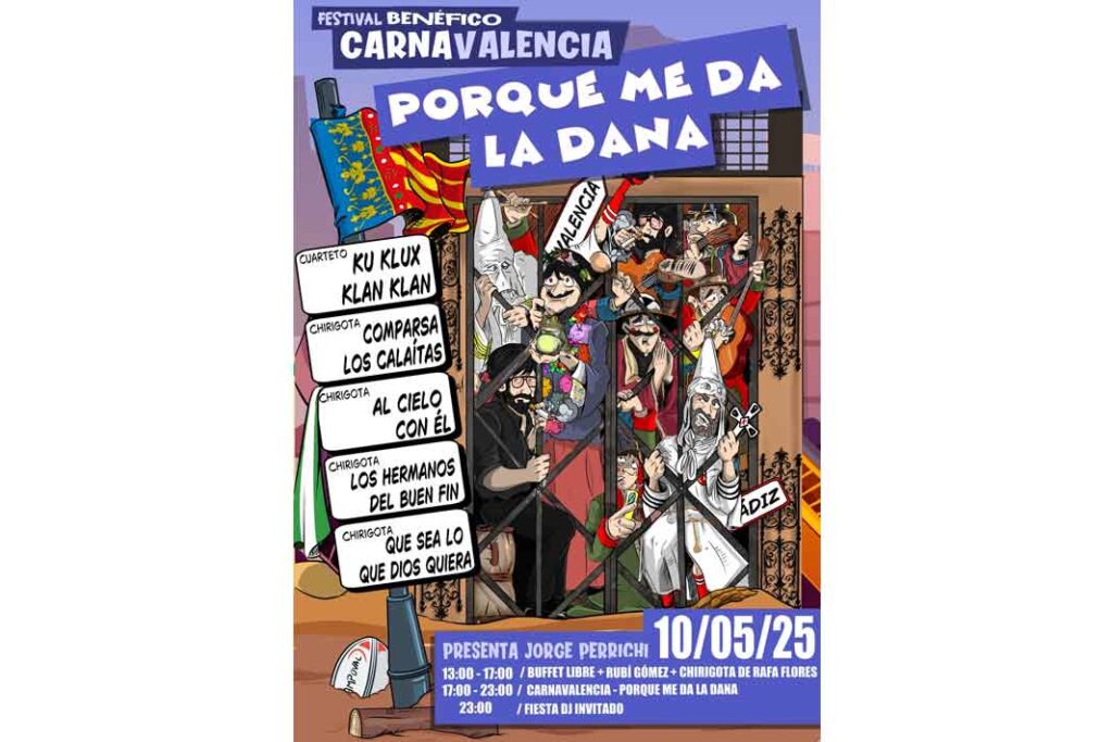 El cartel anunciador de CarnaValencia «Porque me da la DANA», tiene como protagonista el ascensor de la chirigota ecijana y dentro se encuentran componentes de las distintas agrupaciones del COAC participantes en el festival.