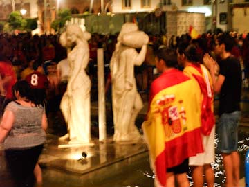Varios miles de personas salían a las calles de Écija, en principio en coche dejándose notar con los claxon, y más tardes, como si de una convocatoria organizada se tratase, a pie hasta el centro de la ciudad después de comprobar cómo la fuente que se ha convertido el escenario de la celebraciones futbolísticas, la dedicada a Miguel de Cervantes, en el cruce entre la avenida que lleva su nombre y la avenida del Genil, permanecía vigilada y vallada para impedir cualquier tipo de celebración, algo que no ha impedido que la fiesta se trasladase a otra fuente y sus inmediaciones, la de la Plaza de España “El Salón”, donde los más impulsivos no dudaban ni un momento en celebrar el triunfo con un chapuzon.