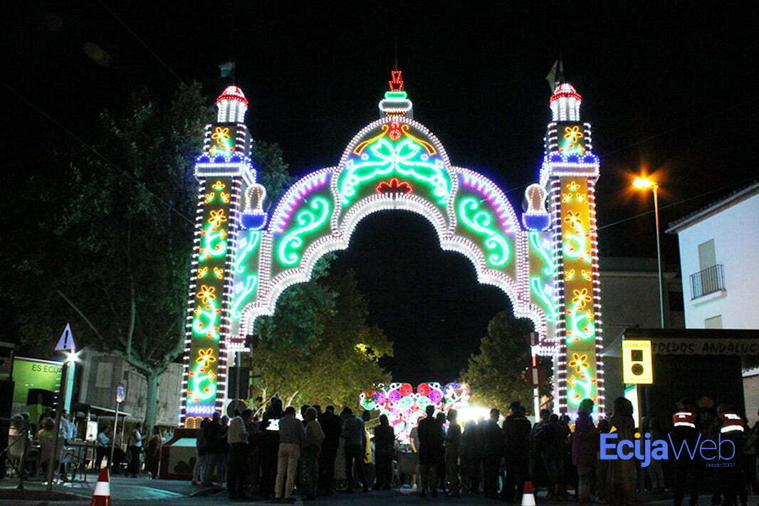 Miguel Rosa Jiménez, un ecijano de 95 años, ha sido el encargado de pulsar el interruptor que ha encendido la portada y el recinto ferial, dando por inaugurada la Feria de Écija 2022, la primera después de tres años que han estado marcados por la pandemia del COVID-19.