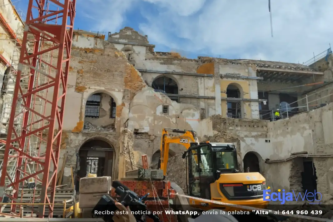 Se han cumplido los seis primeros meses de trabajos en las Casas Consistoriales de Écija, el edificio del ayuntamiento de la Plaza de España “El Salón”. Durante este tiempo las obras más visibles se han centrado en afianzar la fachada principal y la primera crujía, además de demoler algunas estancias del interior.
