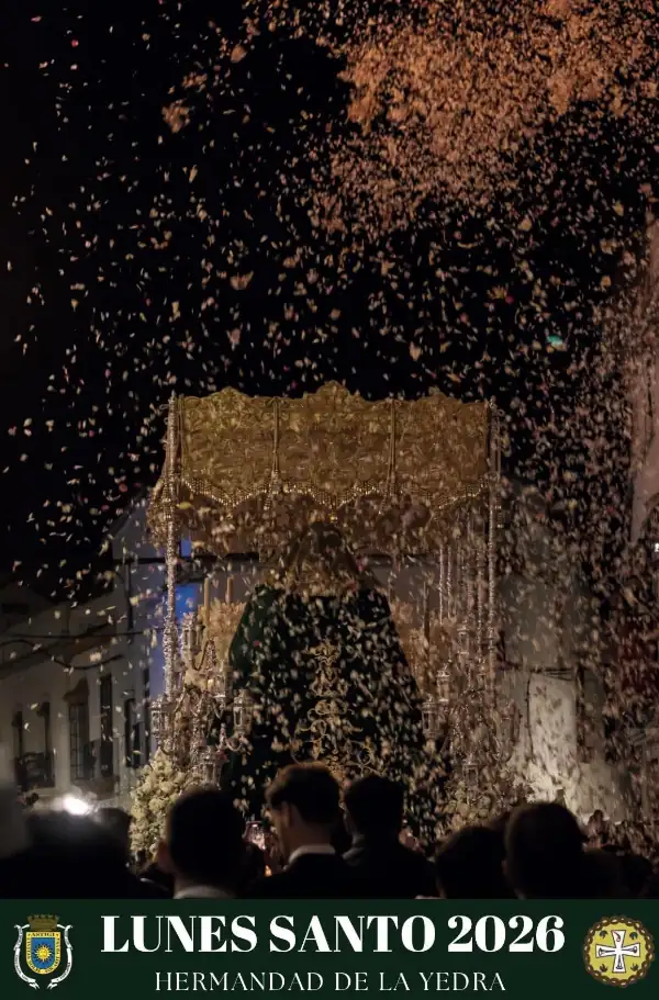 Comenzando por orden cronológico de salida, el sábado 7 de marzo se ha presentado en la iglesia de Santa Ana, el cartel anunciador del Lunes Santo. En esta caso es una fotografía realizada por el ecijano Fernando Moreno, y en ella se puede ver el paso de palio de la Hermandad de la Yedra, desde atrás, bajo una lluvia de pétalos.