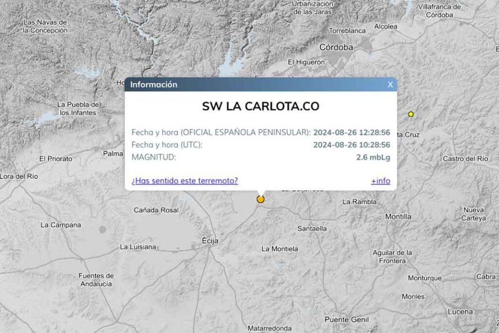 Por otro lado, el portal del IGN también hace referencia horas más tardes, de otro terremoto, esta vez localizado en localidad cordobesa de La Carlota, con una magnitud de 2,6 a las 12.28 horas del 26 de agosto.